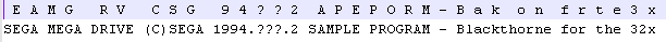 I got my hands on some dumps of random chips from Interplay games, and I believe that some of these chips are from a prototype of the 32x version of Blackthorne. Now, I know almost nothing about the makeup of 32x games (I'm a SNES guy), but it appears that the ROM is interleaved in a strange way. For instance, I found the following string in the ROM: I don't think the chips are corrupt. I actually found a section that appears to have the game script, and comparing it with the script from the final version, it definitely looks like it is interleaved. Is there anyone who knows about 32x stuff who might be able to give me an idea of what is going on with this?