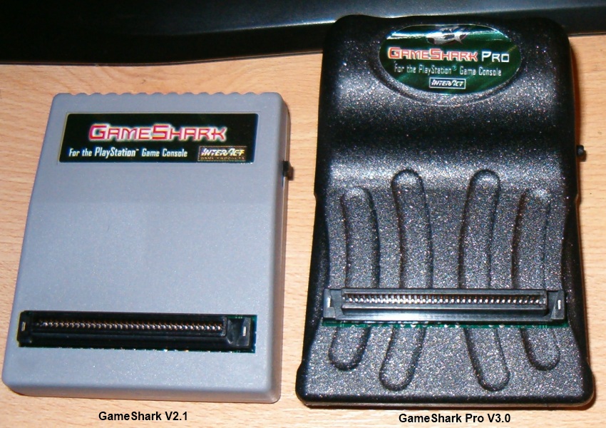 The Action Replay Playstation 1&2 catridge: http://media.giantbomb.com/uploads/0/3142/210144-ar_large.jpg Used the optional PC ISA comms card & Dos Action.exe software to find codes, update, etc. Action Replay Pro (v3) cartridge was bigger (black) catrtridge and had built in memory & in-game interface (froze the game) for finding codes. It was updateable with special Audio CD's that the Action Replay read and converted back to data in order to update. Also connectable to a PC via the parallel port and Windows PC software to find codes and update. http://www.gavsweb.com/images/ActionReplay_Gameshark_v3_Pro.jpg Pic of board, not in cartridge case unfortunatly. Note the RAM chips at the top for the internal trainer and the button on the side to freeze the game. I think the V3 Pro is now probably pretty rare as soon after the release Sony removed the expansion port on the back of the PS1. Action Replay CDX was a bootable CD version. Sony removed the expansion port on the Playstation (to save costs probably as Sony never made a product that used it.... and maybe because they don't like Datel for obvious reasons). http://ecx.images-amazon.com/images/I/414SKwGsaaL._SL500_AA280_.jpg Action Replay was sold as GameShark in the USA by Interact. Unfortunately Interact went bump years later due to bad joystick & hardware sales. The GameShark name got bought up by Mad Catz for stupid money and they released GameShark 4 on CD which was a re-branded "Code Breaker"/"Xploder" (inferior copy of GameShark/Action replay).