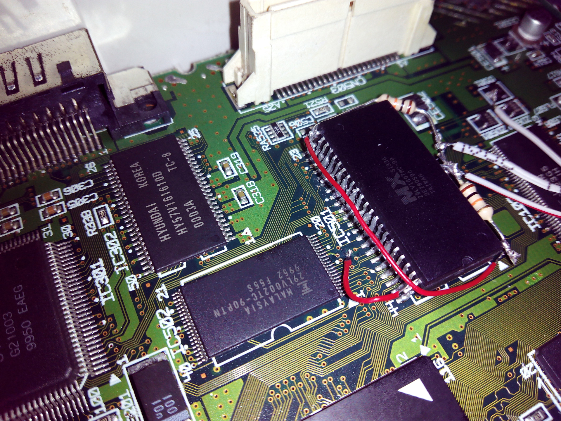 Killed it searching for an alternative point for Bios pin 28. Edit: Ended up killing the board trying to solder to IC 502. Hi everyone. Today i tried to do the piggyback bios mod on one of my dreamcasts. After checking for shorts and continuity between the legs of both bios chips, everything seemed to be in working order so i plugged it and turned it on. The console booted up but got stuck at the Dreamcast logo for about 2 minutes before going to the menu. After that the menu works great, but no disc is ever recognized. If i insert a disk, it spins as usual, but the console gets stuck at the "checking disk" message. So after triple checking everything, i spotted a potential problem at leg 28 of the original chip. It seems like the pad in the motherboard went missing. I tried to follow the trace, but it goes beneath an adjacent chip, and i can't follow it. Can anyone please help me find an alternative spot for that pin? My motherboard is a VA1. Here is a picture of the pin already lifted: Thanks in advance.