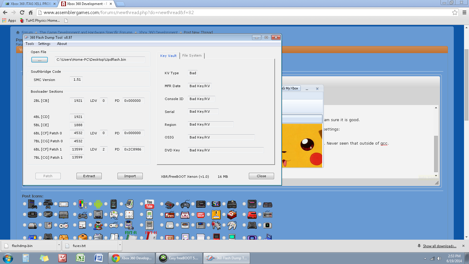 A second thread, to get the man cave rolling. My friend recently gave me a Xenon JTAG with the typical SMC wiring done. Except, it doesn't have the diodes. Not sure if that's fatal. Also, it's missing a DVD reader. I dumped the nand over Xell Reloaded's LAN feature, which worked spectacularly (my props to the developer) and I copy and pasted the CPU key, so I am sure it is good. I then went into Easy Freeboot (once again, my props to SneakyPeanut and the Freeboot team) and tried to make a udpflash.bin. I used the following settings: 13599 dash, Xell Reloaded, No DVD Drive, Stock SMC, Check with 360 flash tool, autodetect SMC. It created my file, and all is well until I put it into root on a usb flash drive and attempt to boot it with Xell Reloaded... It gives me a segmentation fault. Never seen that outside of gcc. So I thought: maybe he had a bad nand on there prior. So I tried it again, this time with donor files: 13599, Xell Reloaded, No DVD Drive, Stock SMC, Use donor files, Check with 360 flash tool, autodetect SMC, donor file region: USA. I put it in my console, same thing. I have no clue what I'm doing wrong. 360 flash tool may be trying to tell me it's the KV: It says that for both the donor nand and my nand. What am I doing wrong? Can anyone here give some advice on what they would do/have done in a tricky situation like this? Thanks mates.