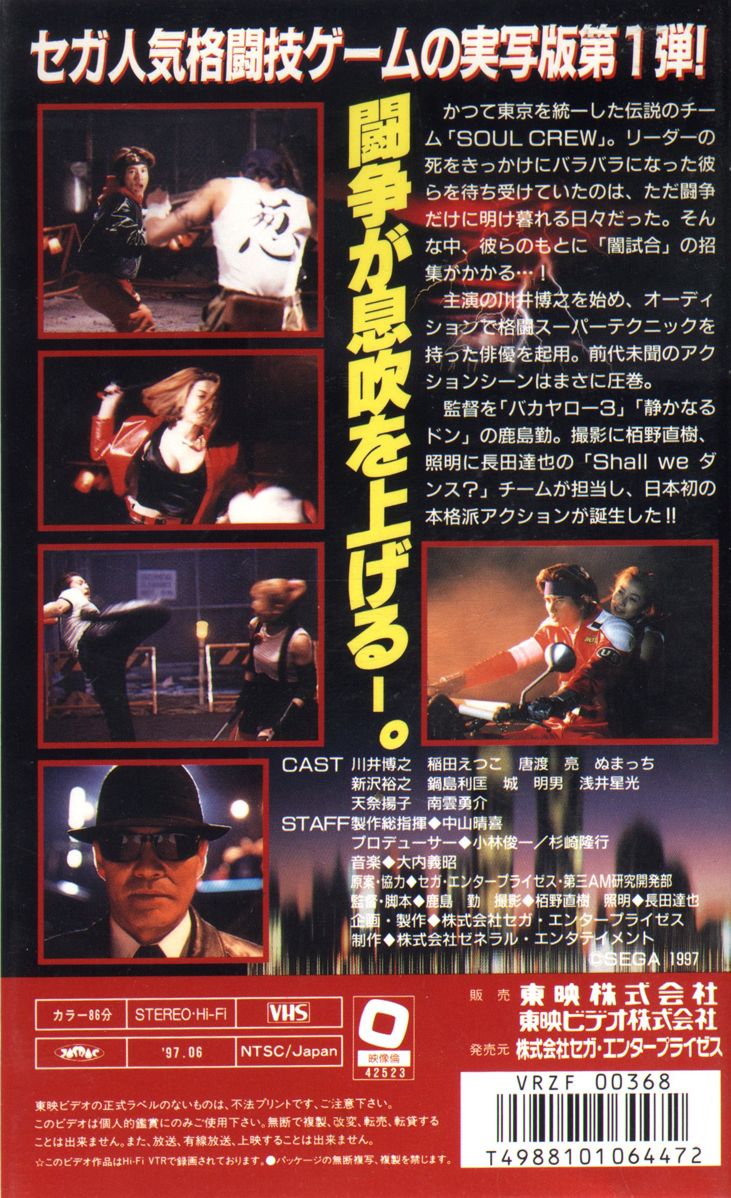 Oh hey, what's this? http://www.roushimsx.com/sa/LastBronx.avi Perhaps you would like a preview! http://www.youtube.com/watch?v=sRCwSOIXmpU Mono sound (sorry!) and composite off of a VHS tape (eww!), but if anyone wants to donate an svhs player w/ stereo outputs in the name of preserving an embarrassing, unholy abortion of a video game movie, I'd be down for sitting through this one more time. Just one more time. Wait until you see the music scenes. I've half a mind to upload one of those to YouTube while I'm at it. Will update this post with a better scan of the cover sometime this weekend if anyone really wants it. File this part under totally not work safe, but at the tail end of the tape is a preview for the most Japanese movie I've ever seen. Note: nudity and general insanity. Not in Last Bronx, unfortunately. The girls that played Lisa and Yoko were hella cute. I would not be surprised if they have since had a lengthy and generally unimpressive careers in pinku films following Last Bronx. edit 1 - After the movie there's an interview with the game's producer http://www.roushimsx.com/sa/LastBronxInterview.avi If someone wanted to take the time to subtitle that and upload it to YouTube, I'm sure there'd be a lot of people who'd appreciate it. Hell, if someone just wants to translate the script, I could time/apply the subtitles if you didn't want to deal with it. Lord knows I've been slacking on uploading new videos to YouTube over the last 3 years or so. edit 2 - I decided to give YouTube a shot and uploaded the whole darn thing http://www.youtube.com/watch?v=zzmkKOhHWn0 So in case you're stuck at work and need something to brighten your day, you've got Soul Crew in your corner.