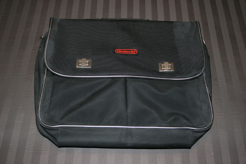 nintendo messenger bag w/ "fast foward" embroided on the front (1990's?) nintendo messenger bag w/ metal locking tabs playstation system carrying case w/ gear rain repellent jacket (size XL), a tin of mints and a playstation binder w/ steno pad I believe that I received all of them as press items and all have never been used other than carting them back from their respective E3 events