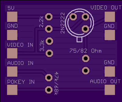 [New revision of my guide] I purchased a pakage with games and a 7800 ProSystem console. It was modified to output C-Video and Audio, in order to get a better quality of both image and sound The work with the new amplifier board has just begun. The C-Video amplifier is located on the left side, while the circuit for the two Audio signals are located ont the top right side on the board. On the subside of the board, there are four rubber feet glued onto it, keeping it away from shorting to the motherboard This is the board itself. Some wires run to different positions of the motherboard, where they are soldered for proper connection A closer look at the connection of the Audio. The wire that runs to POKEY In is soldered to the top of the C14, while the the wire that runs to the Audio In, is soldered to the bottom of the C10 This is the schematics for the circuit. 75 / 82 ohm means that you may choose between 75 or 82 ohms on that resistor. 47k / 68k means that the resistance should be between these values, given that 47k is the lowest and 68k, is the highest value accepted. I picked a 68 komhs resistor, but that is not necessary to do. Pick one that is closer to the 47kohm instead. It is also optional to replace R11 on the motherboard with a new resistor, that is 47 komhs. Doing so will decrease the brightness of the image The cartridge slot is very small, but it's casing could easily be removed temporarely, while soldering the wire to POKEY In, on the top of C14. That way it wont get damaged if the soldering iron gets to close. Once done with that wire, just put back the casing in it's place around the cartridge slot The system is now connected to the new circuit(Note that some wires were exchanged, after I took the picture). I dragged the C-Video In and +5V to the subside of the motherboard and soldered them down there. I choosed to not remove the expansion interface There is a hole in the RF-shield that gives you the opportunity to run out the wires from the inside. That way you wont need to drill a new hole in the shield. It is also possible to solder the GND-wire to the shield, for an easy connection to the GND When the work done to the motherboard is finished, and the RF-shield reassembled, it can be placed back in the casing again. I would rather have the RCA-jacks coming out from the side but it turned out to be very tight down there, so they were placed on the bottom of the top egde instead, at the left side of the console. Solder the wires from the AV-board to the RCA-jacks Once they are on place, reassemble the system. The RCA-jacks goes downwards from the top egde on the left side of the console Then it gets hooked up to the monitor for testing of image quality I started with Galaga. The image looks better in reality, compared with this picture. It is hard to get at good shot from CRT's I took a picture of the the boot up-screen. It looks a little like the one on 5200 SuperSystem, apart from that there is no game title featured on the bootscreen While testing the games included in this purchase, I quickly found a new favourite, Robotron 2084. It was fun to play It feels like a platform version of Asteroids, except that you use two joysticks while playing. One to move around and the other one to shot, in the direction you point the stick. Even the VCS games workd great Hope you all enjoy this guide and that it will come to a better use than the old one