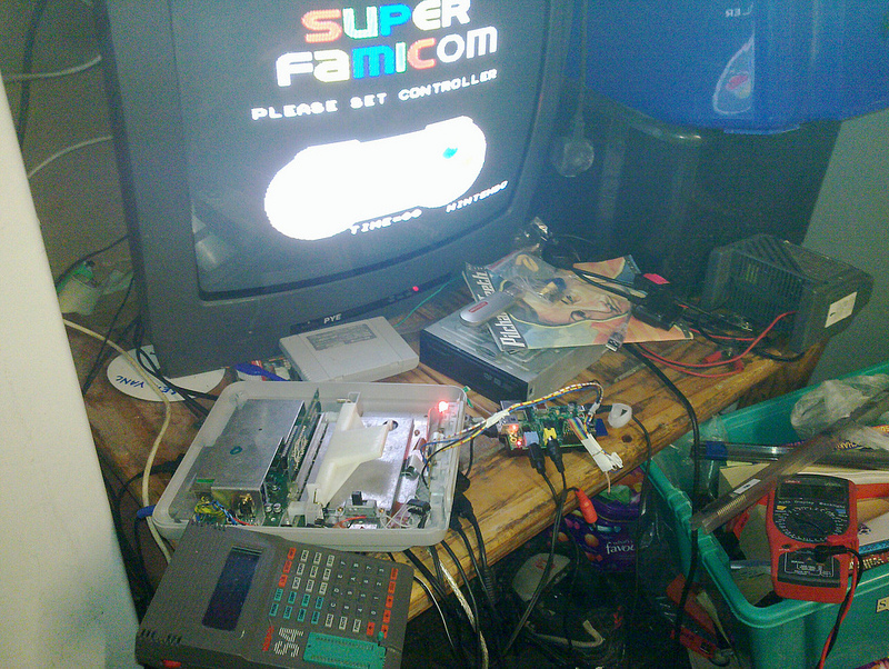 Update time, sorry about the crap video but as I've discovered, it's hard to film a CRT with a camera phone! It's a short video of the mess that is my workbench and of the Pi completing the Nintendo Controller Test: [video=youtube_share;qKzb42Lm0YE]http://youtu.be/qKzb42Lm0YE[/video] I've managed to get live joystick input working, it's connected like this: Playstation 2 controller -> PS2 to USB converter -> Raspberry Pi -> GPIO -> 2 x 4021 shift registers -> SNES controller port It actually works pretty darn well! I was able to pull off some 32 hit combos on Killer Instinct so I'm classing that as tested and working! I've started on recording and playback support which just about works as long as I don't press the buttons too fast. After trying to optimise my code by using memory buffers instead of reading/writing from files directly I've had a bit of a eureka moment and figured out where the problem with my code is. (warning: boring bit) Right now I am basically dumping the evdev data from the Linux kernel (/dev/input/js0 and /dev/input/event0 for the keyboard), along with the current latch pulse and then replaying the data back out through the GPIO pins on the Pi. I was seeing drifts on the latch pulse, so the Pi was up to 8 latches behind. I couldn't figure out why as live input seemed to work just fine and I'm sure that the Pi should be fast enough to respond but then I noticed this bit of code: https://github.com/SonnyJim/snesbot/blob/master/snesbot.c#L344 The program flow is: Read evdev data into some variables, one button press at a time Wait for the correct latch Write data to GPIO pins Go back to reading in the evdev data The problem occurs when two buttons are pressed on *exactly* the same latch, my code currently doesn't account for this so it can take a while for it to catch up again, meanwhile the SNES latch and program latch are now out of sync and crapness ensues. I'm not sure how to fix it yet, I may have to take a different approach where the evdev data is preprocessed before playing back. Getting very close to it playback working now though