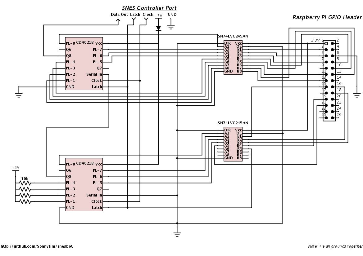 Got bored today so I'd thought I'd have a go at making something interesting, which was using my Raspberry Pi's GPIO pins to interface with the SNES controller port. Because I'm skint I'm using whatever I have lying around, which is the Retropie GPIO adapter. Normally, these are used to connect a SNES controller to a Raspberry Pi but I'm thinking it should work just as well the other way round. The ultimate aim is to have something I can playback TAS runs onto real hardware, but for now I'm just going to see if I can get the start button to work ;-) One issue that popped up quickly was the speed at which I'd need to poll the GPIO pins, which according to this helpful document is ~12us, according to what I've read here the library I'm using (wiringPi) should be ok (83Khz vs ~7Mhz). Couple of questions: Q1. I read here that the controllers are happy with anything from 3V-7V, does anyone know if the console itself will function with 3.3v inputs on the data line? I'm guessing a quick read of the schematics and relevant datasheet will help me here. I only ask this as it appears the RetroPie GPIO adapter only outputs 3.3v and I'm wondering if that's going to be a show stopper. Q2. Am I insane? Wouldn't it be a lot easier to use a microcontroller and interface the Pi to that? p.s Some shoddy source code is up here, https://github.com/SonnyJim/snesbot