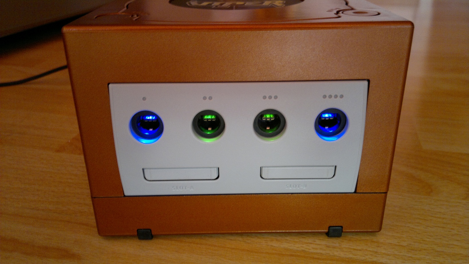 that's pretty gnarly. Good job. Real curious how you put LEDs in the controller ports http://retro-hack.blogspot.com/2012/12/playing-backups-on-gamecube-making-your.html XenoGC has been open source for a while now