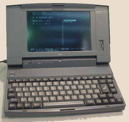 That looks like a PC-9801 notebook, but the 9801 is a tad underpowered, best to try and get a PC-9821 if you want to play anything decent. As for shooters, not the best machine to have there is Steam Hearts, Xenon 2 and Gaplus (I *reallly* want that...) and a few others. It a better machine if you like Mahjong games like I do...