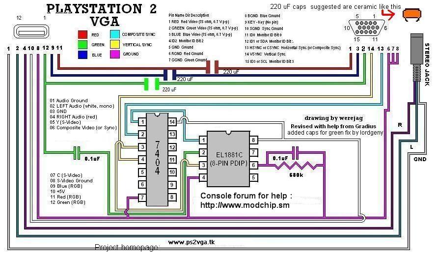 I tried to Google this but all I can find are VGA to PSOne LCD, not from PSX/PSOne console to VGA. There are VGA out adapter for PS2/3 but I'm not paying $20 if I can make one cheaper. I found a wiring diagram for PS2 video port to VGA, would that work for PSX or would I need to do something else? I also noticed on many PS2 VGA mod, some people wired directly off the chip on PS2 mobo to get H and V sync rather than relying on chips for sync separating.