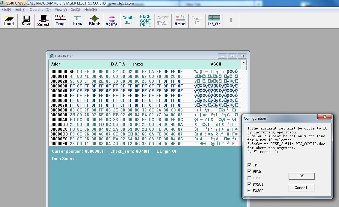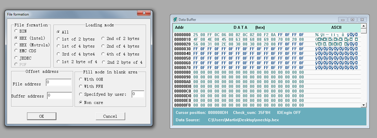 just tried programming it and another dud happened. it wrote the first few lines and put zeros in the rest of the addresses. what would be the correct settings to load the hex file in from the window on the left?