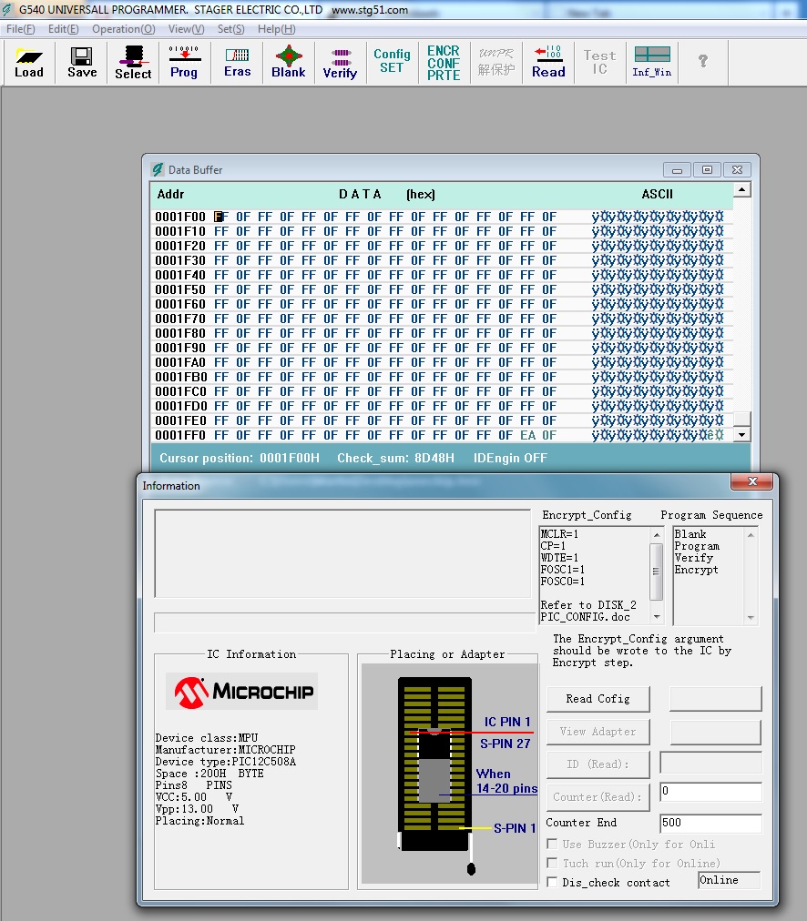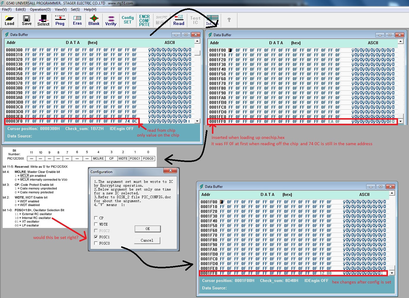Hi there, I haven't really had much success trying to burn the onechip.hex (downloaded from http://www.eurasia.nu) on to my 12c508A OTP chip for psone 102 41(A). if i read the blank chip it gives me address hex 0000000 FF 0F FF 0F FF 0F FF 0F FF 0F FF 0F FF 0F FF 0F ...down to address 0001FF0 FF 0F FF 0F FF 0F FF 0F FF 0F FF 0F FF 0F FF 0F However 1 address shows this 00003F0 HEX FF 0F FF 0F FF 0F FF 0F FF 0F FF 0F FF 0F 74 0C <-- Last 4 hex digits, would that be the internal osc hex code for that chip? but then when i load up the onechip hex into the G540 programmer the onechip hex is there and on address line 0003F0 it still ends with 74 0C and the onechip hex also adds to data to the last address line 0001FF0 HEX FF 0F FF 0F FF 0F FF 0F FF 0F FF 0F FF 0F EA 0F < last 4 digits changed on address line 0001FF0. on top of that i need to know the config settings are for CP, WDTE , FOSC1, FOSC0....and there's not an option to set MCLR. I have tried to include screen shots to give you some ideas as to what i am working with. Any help would be great.