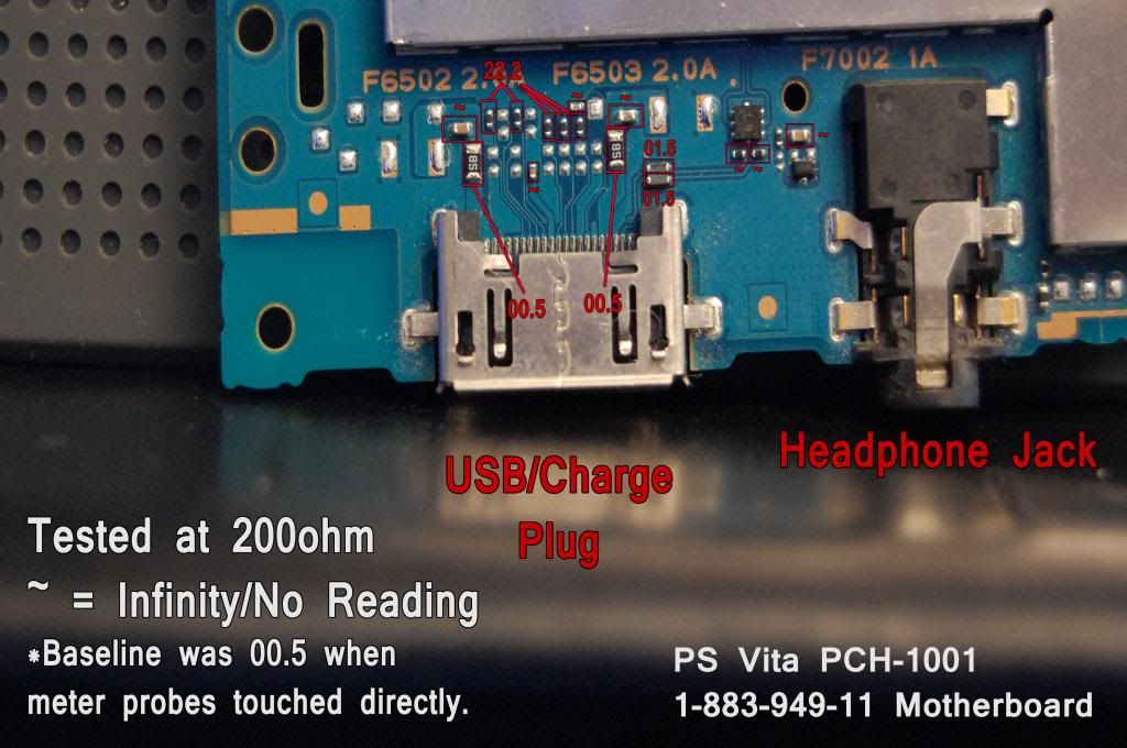 PS Vita Motherboard Tests PCH-1001 1-883-949-11 Alright well I spent more time looking at this Vita charging issue. I probed around with the multimeter and test light and recorded the readings I was getting and compared them to my own fully functioning Motherboard. Don't believe I saw any difference in readings anywhere. The only signs of power I saw while the charger was plugged it was off one of the plug socket pins toward the right side, through the black "SB" on the right side (00.5 reading), and to the little thing right above it (~ reading). It only had power on the left side of that little thing. And had power on the solder pad directly right of that thing as well. Tested this on both the bad and good motherboards and got the same results. Again, not super experienced with a multimeter but I'm working on it. I'll post the pictures but also directly link them so you can hopefully zoom in all the way to read the stuff. PS Vita Motherboard Front Readings PS Vita Motherboard Rear Readings