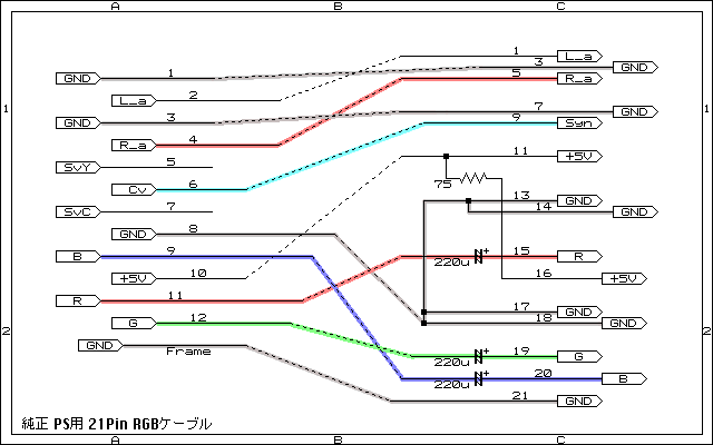 Pin 9 is composite video and not composite sync, they are not the same signal but as most TVs will detect Composite Video it will automatically strip the sync from it. It sounds like your device is not doing this as the Supergun, DC and Saturn are working fine (the DC and Saturn do have a seperate composite sync). You can build a simple sync stripper with a LM1881, 2 0.1uf caps (non electrolytic) and a 680K ohm resistor. There is a good electronic shop in Akihabara Click here for a nice picture of the shop and here for the location Here is the circuit diagram as from the data sheet. You only need... Pin 1 - Composite Sync (to cable) Pin 2 - Composite Video (from cable, any ground, esp 21) Pin 4 - Ground (from cable) Pin 6 - Reference, solder cap over resistor, then resistor to pin 6 and the other end to pin 4 Pin 8 - +5V (from pin 11 of cable)
