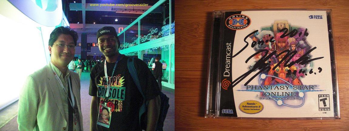 Signed DC copy of Phantasy Star Online (U.S.) by Yuji Naka I had a feeling Naka-san was gonna show @ E3 2011 so I brought along my Dreamcast copy of Phantasy Star Online to have signed and took a photo with him. Very nice guy :nod: