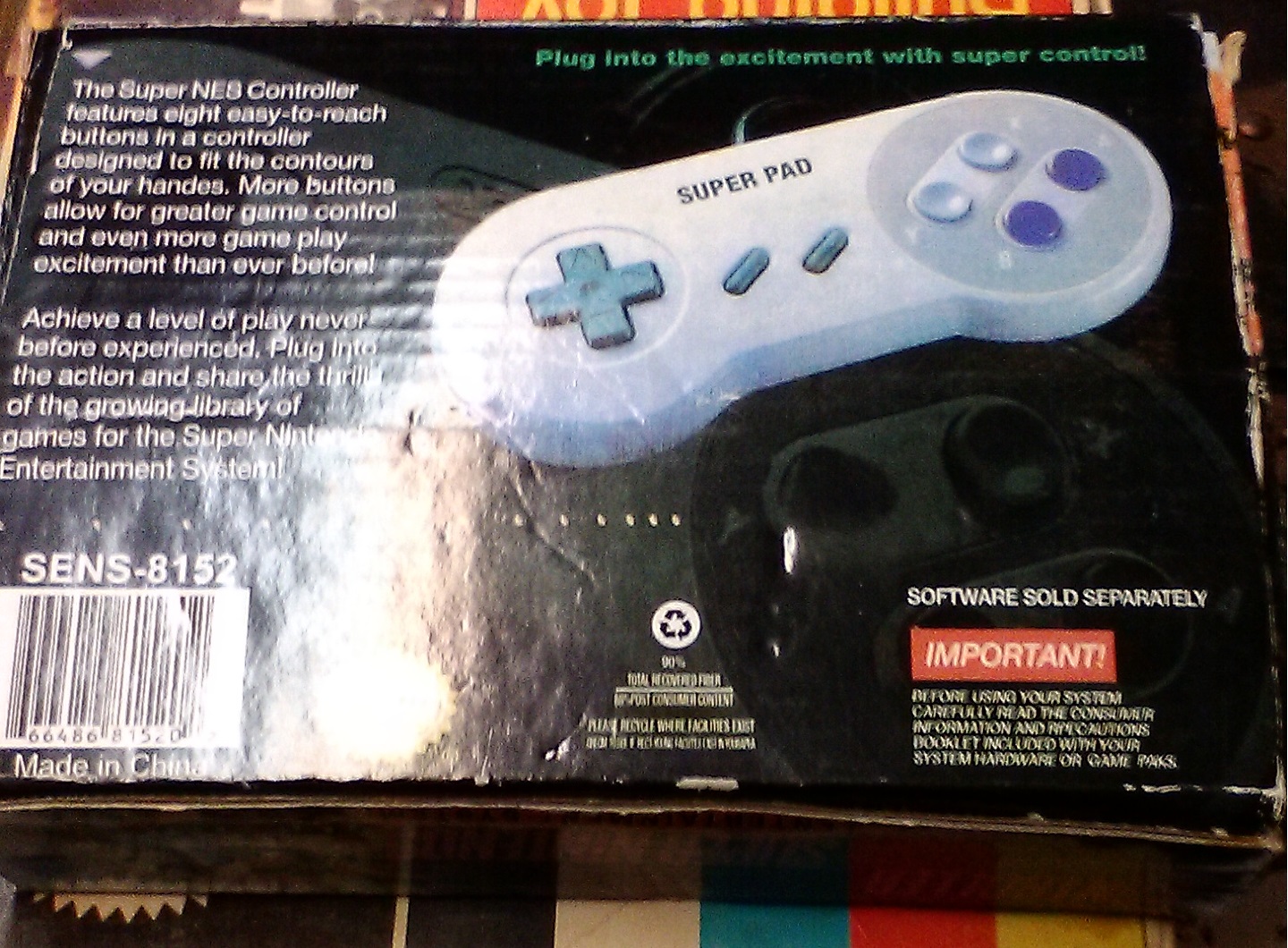 Ran into this impressive knockoff at an antique shop today. From a distance, it looks like an ordinary NA Super Nintendo controller box... ...But it's not. It happens to be low-quality pictures of the SNES Super Pad, confidently guaranteed to be in good working order by the Super Pad Seal of Quality in the lower left-hand corner of the box. The back of the box features the exact same type as the genuine one, but with the Nintendo logos removed. and another "Super Pad Seal of Quality" label. Model No. SENS-8152 I briefly opened the box to take a look at the controller. Good quality for a generic, but nothing notable.
