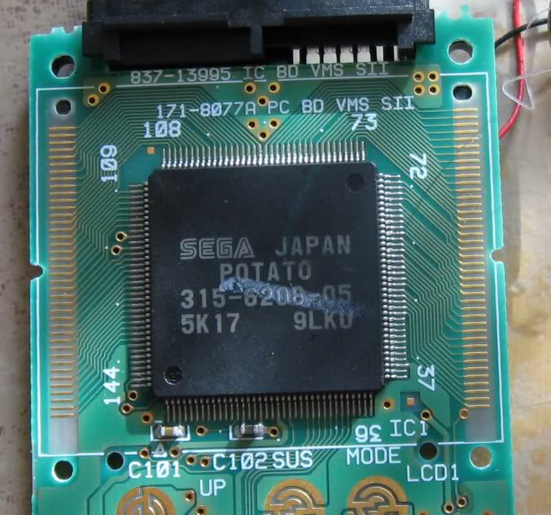 The potato chip is based on the LC8610, here's a datasheet on the processor: http://pdf1.alldatasheet.com/datasheet-pdf/view/41059/SANYO/LC86104C.html I couldn't tell you how they stuffed the extra ram in there. It has to be same type of non volatile memory. At least I think I remember my VMU keeping my saves when I replaced the batteries.