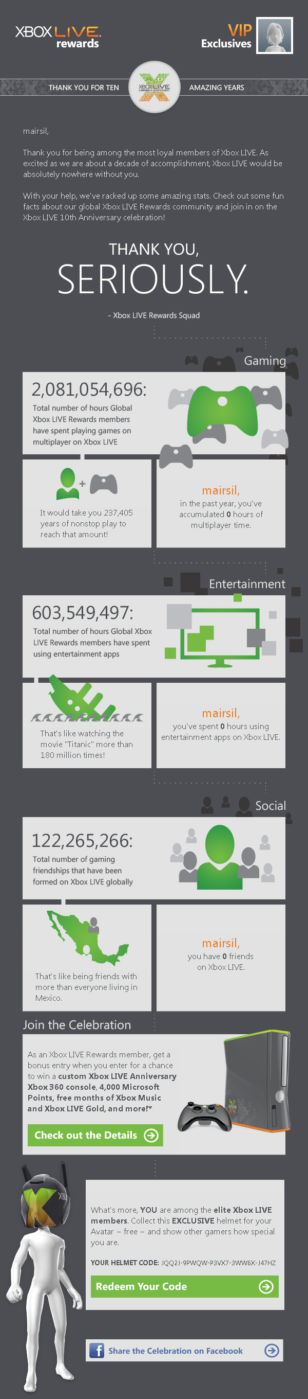 Oh man, what a load of crap. I got that mail too but after the online friends section it just gives a link to shitty facebook. I have no mention of the limited XBOX or the helmet. It also says I've only played up to 19 hours online??What???? It's way over that. It looks like Microsoft's stats computer is broken.